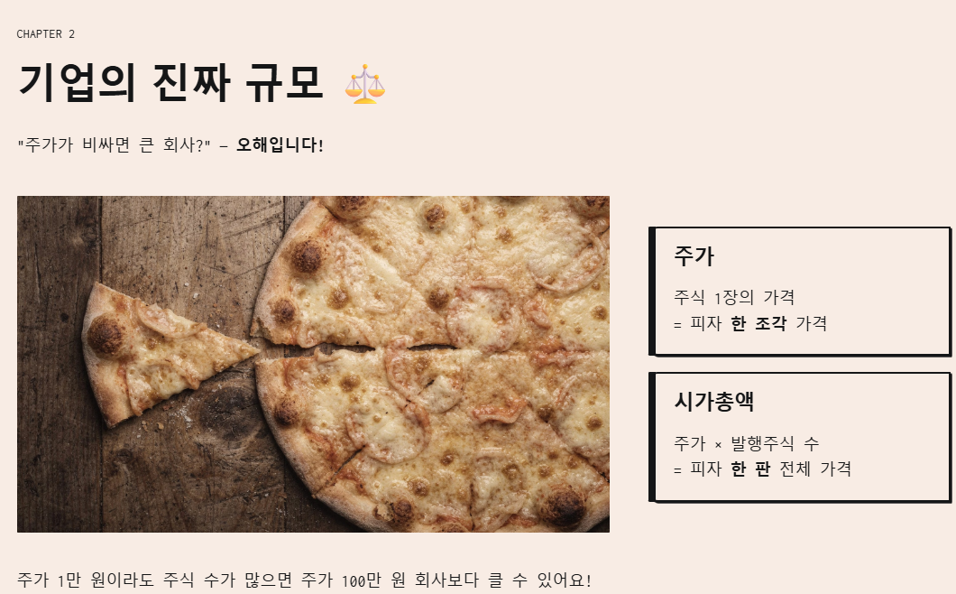 | 시가총액 | 주가 × 발행주식 수 | 피자 한 판 전체 가격 |