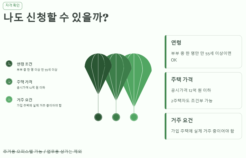 - 연령: 부부 중 한 명이라도 만 55세 이상이면 가능합니다.