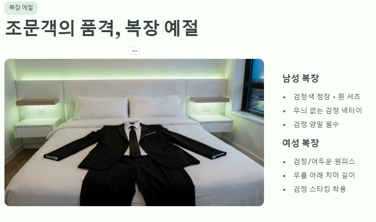 - 복장: 검정색 계열의 단정한 정장과 양말(맨발 금지).