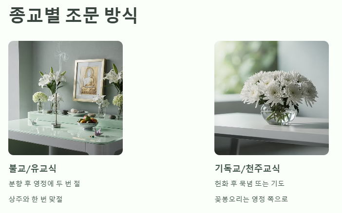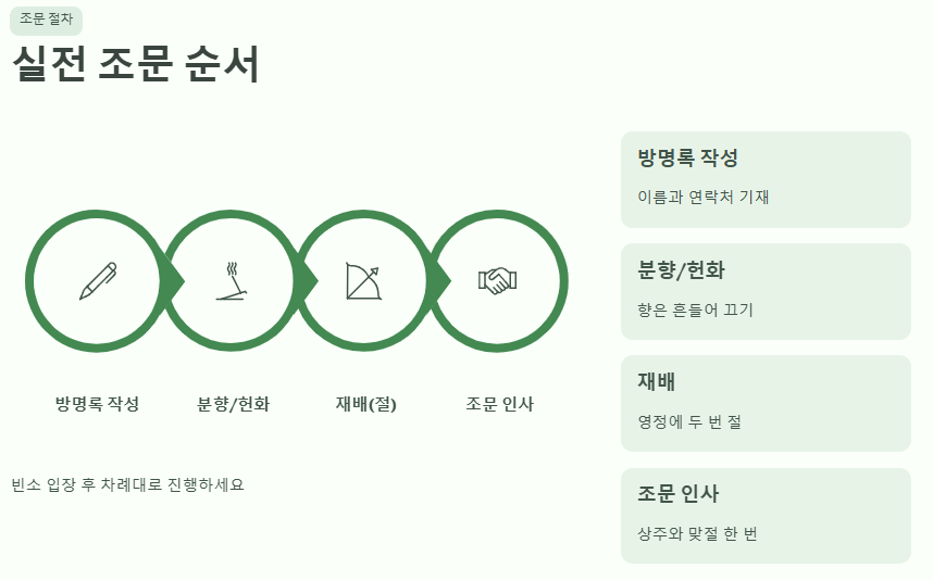 | 3. 조문(인사) | 상주와 맞절을 한 번 하거나 정중히 고개를 숙여 인사합니다. |