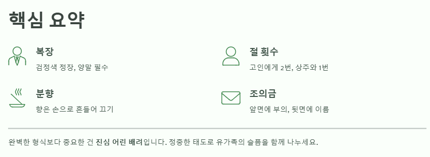 장례식 예절의 본질은 완벽한 형식이 아니라, 유가족의 슬픔을 배려하고 함께 나누고자 하는 진심입니다. 조금 서툴더라도 정중한 태도를 유지한다면 그 마음은 충분히 전달될 거예요.