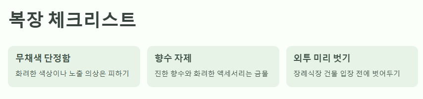 - 여성: 검정색 상하의나 어두운 계열의 원피스가 적당합니다. 치마를 입을 경우 무릎 아래로 오는 길이를 선택하고, 반드시 검정색 스타킹을 착용하여 맨발이 보이지 않게 합니다.