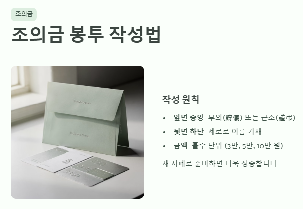 ※ 금액은 홀수(3, 5, 10만 원) 단위로 맞추는 것이 전통 예법입니다.