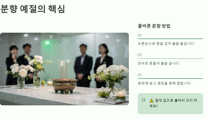 | 1. 분향/헌화 | 오른손으로 향을 집어 불을 붙인 뒤 좌우로 흔들어 끕니다(입으로 불지 마세요!). |