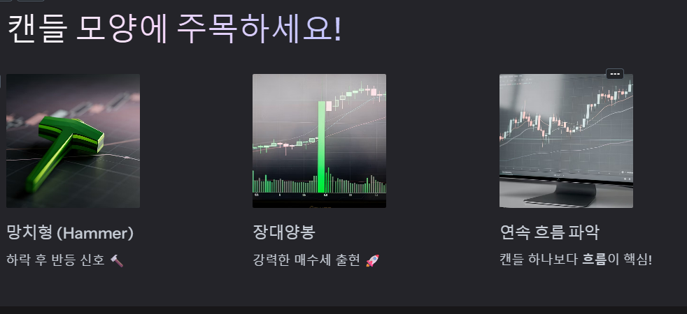 단순히 색깔만 보는 것이 아니라 모양에 주목하세요. 하락 후 나타나는 망치형(Hammer)은 반등 신호가 될 수 있고, 몸통이 아주 긴 장대양봉은 강력한 매수세의 출현을 의미합니다. 단, 캔들 하나에 일희일비하기보다 연속적인 흐름을 파악하는 것이 핵심입니다!