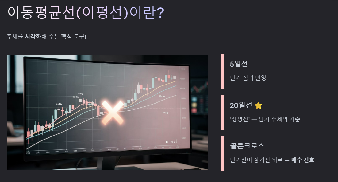 이때 추세를 시각화해 주는 것이 이동평균선(이평선)입니다. 5일선은 단기 심리, 20일선은 '생명선'이라 불리는 단기 추세를 나타내죠. 단기선이 장기선을 뚫고 올라가는 골든크로스는 대표적인 매수 신호로 꼽힙니다.