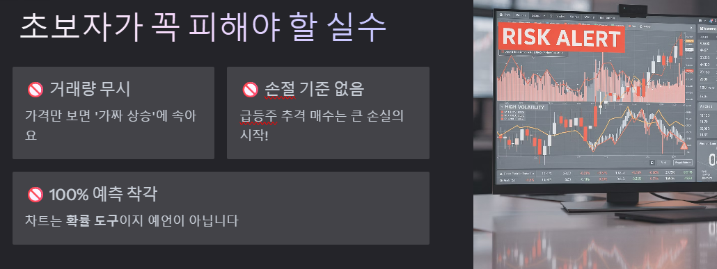 차트는 100% 미래를 맞추는 예언 도구가 아닙니다. 거래량을 무시하거나, 손절 기준 없이 급등주를 쫓아가는 행위는 매우 위험해요! 차트를 확률적인 도구로 대하는 태도가 필요합니다.