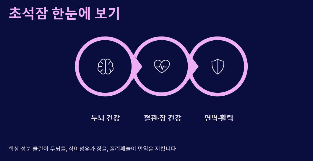 - 1. 뇌 건강 및 기억력 보조: 초석잠의 핵심 성분인 '콜린(Choline)'은 신경전달물질 합성을 도와 기억력과 집중력 유지에 긍정적인 역할을 합니다.