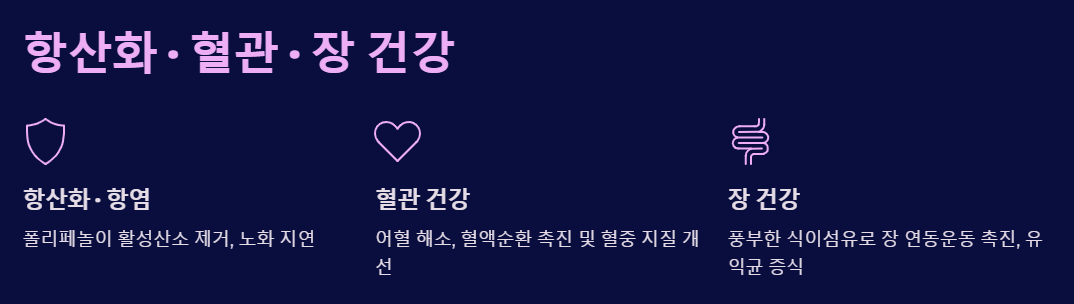 - 2. 항산화 및 항염 작용: 폴리페놀 성분이 풍부해 체내 활성산소를 제거하고 노화를 지연시키는 데 도움을 줍니다.