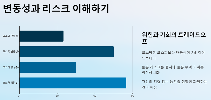 - 리스크: 변동성과 위험도는 코스닥이 코스피보다 훨씬 큰 편입니다.