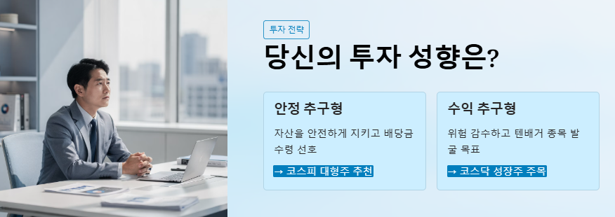 - 안정 추구형: "나는 큰 수익보다는 내 자산을 안전하게 지키고 배당금도 받고 싶어" 하시는 분들은 코스피 대형주가 적합합니다.