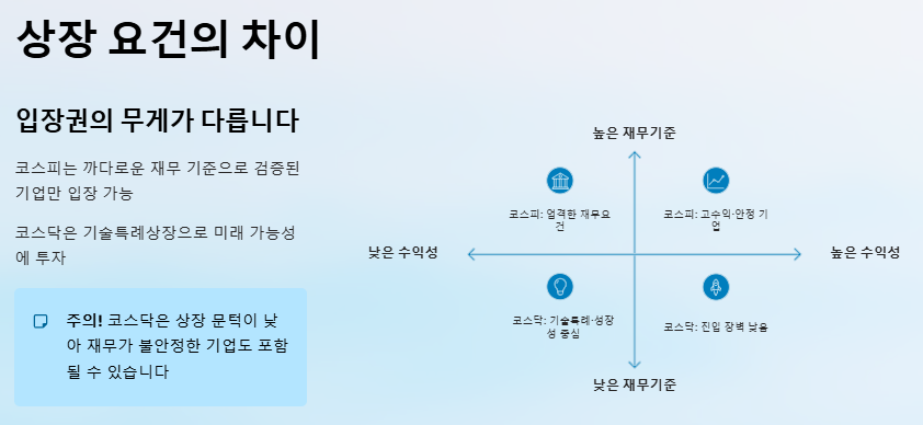 - 상장 문턱: 코스피는 재무 실적이 중요하고, 코스닥은 미래 성장성과 기술력을 더 높게 평가합니다.