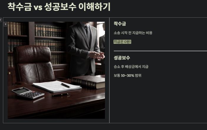 착수금은 소송 시작 전에 변호사에게 지급하는 비용이고, 성공보수는 소송에서 승소하여 배상금을 받았을 때 그 금액에서 일정 비율을 수수료로 지급하는 것입니다. '착수금 0원'은 시작 비용이 없다는 의미예요!