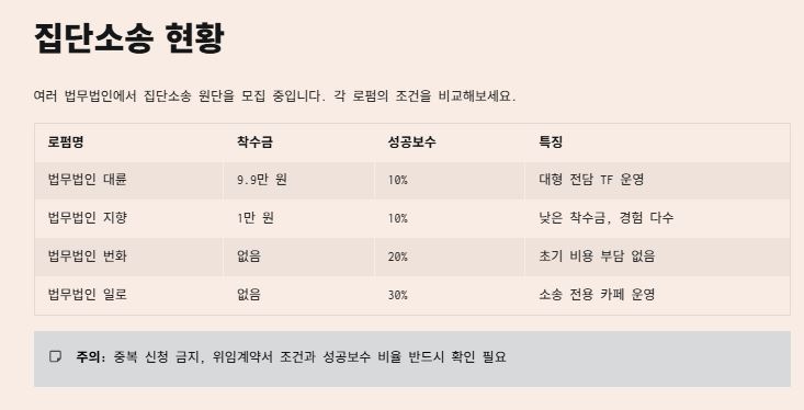 많은 피해자분이 관심을 가지시는 것이 바로 법적 배상이죠. 현재 여러 법무법인에서 집단소송 이단을 모집하고 있습니다. 각 로펌마다 조건이 다르니 꼼꼼히 비교해 보셔야 해요.