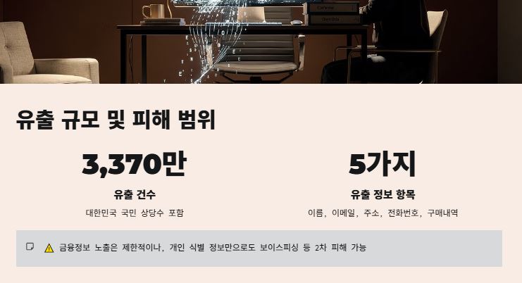 이번 사고는 2025년 6월경 발생하여 11월에 인지 및 통지가 이루어졌습니다. 유출 규모는 약 3,300만~3,370만 건으로 대한민국 국민 상당수가 포함된 대규모 사건이에요.