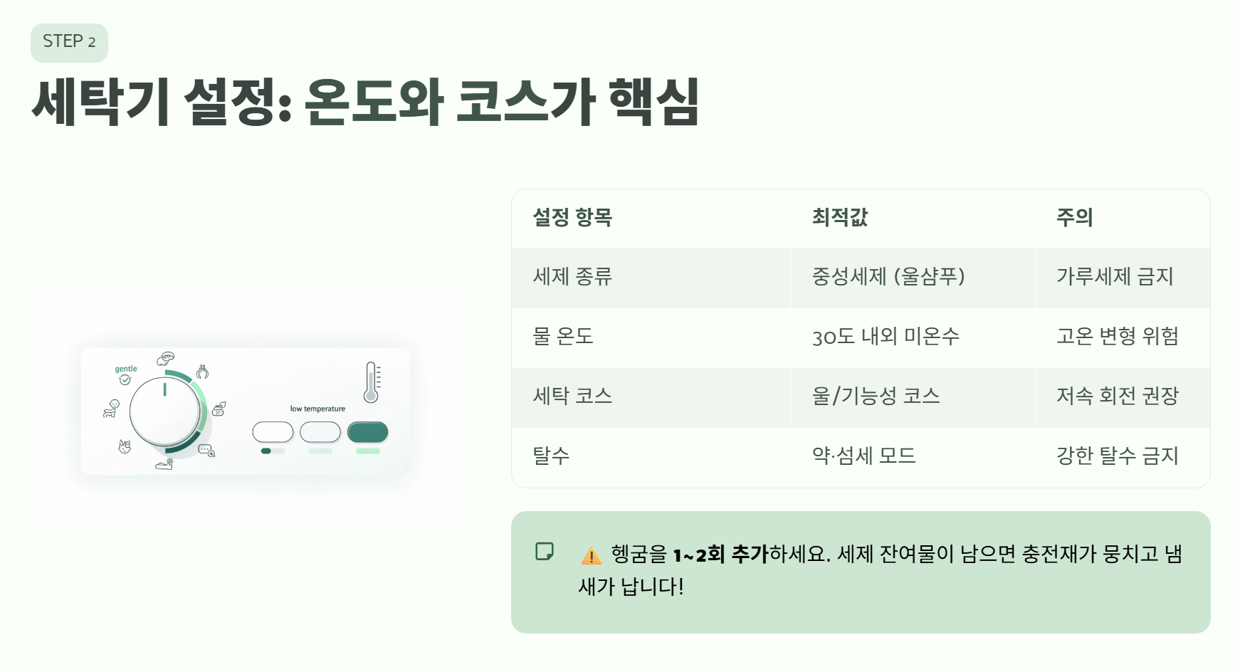 - 헹굼 추가 필수: 세제 잔여물은 뭉침과 냄새의 주범입니다.