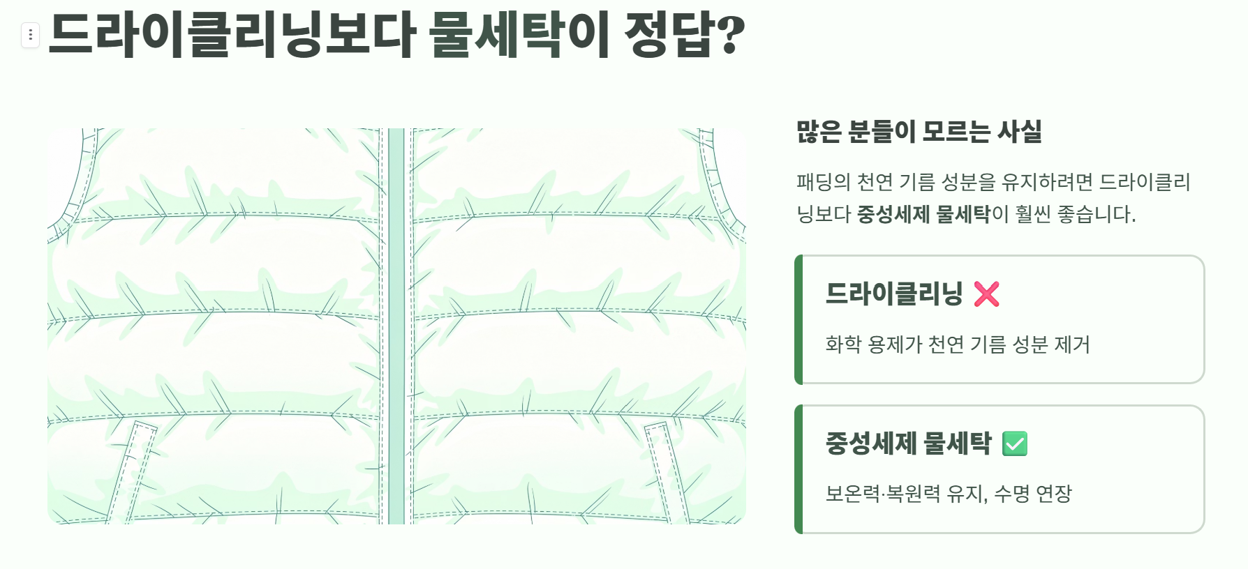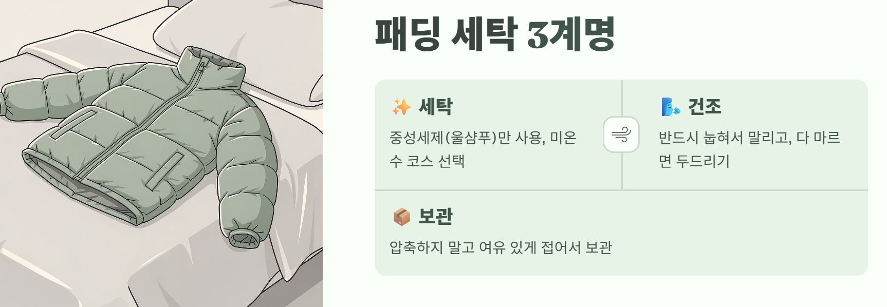 - 중성세제 사용: 일반 세제는 패딩의 수명을 깎아먹어요.