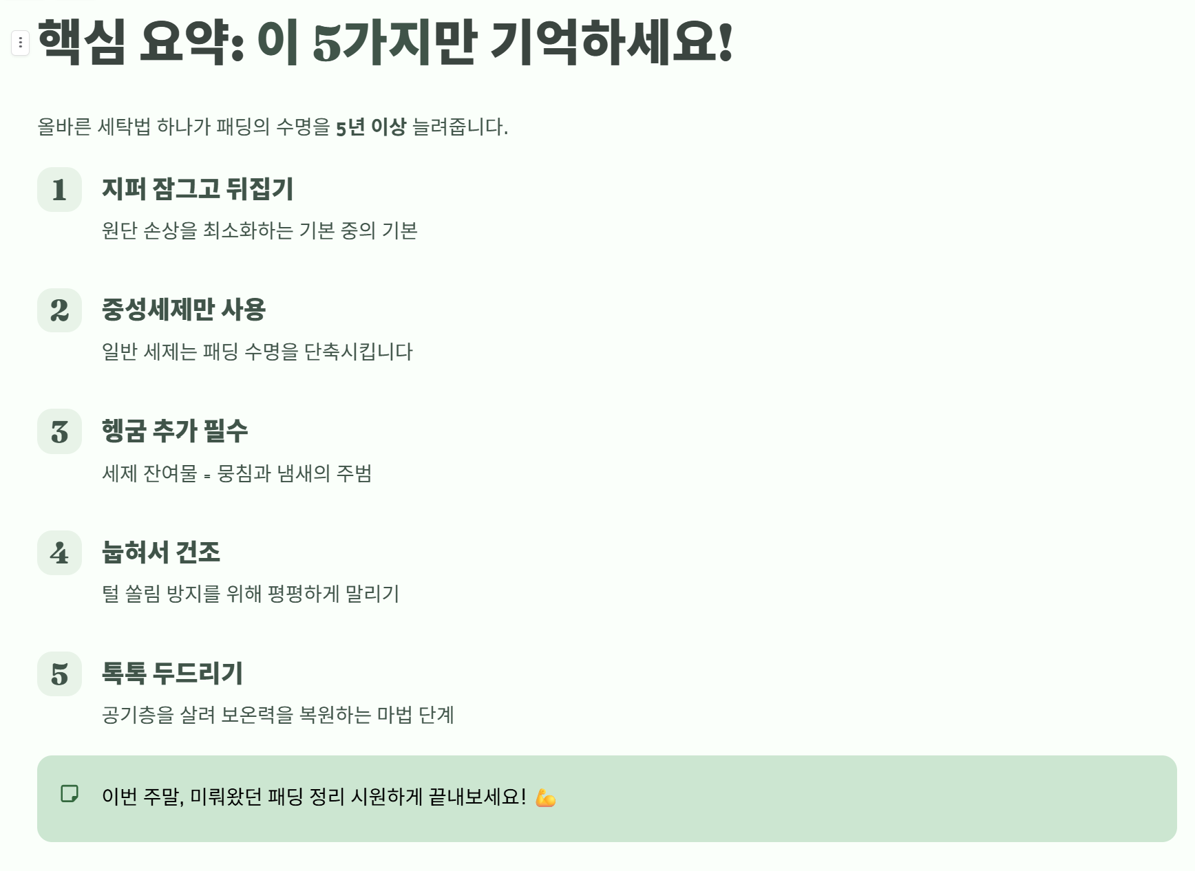 오늘 배운 내용을 한 번 더 정리해 볼까요? 이 5가지만 기억해도 패딩 세탁 전문가가 될 수 있습니다!