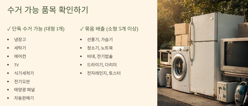 | 단독 수거 가능 | 냉장고, 세탁기, 에어컨, TV, 태양광 패널, 전기오븐, 식기세척기, 자동판매기 등 대형 가전 |