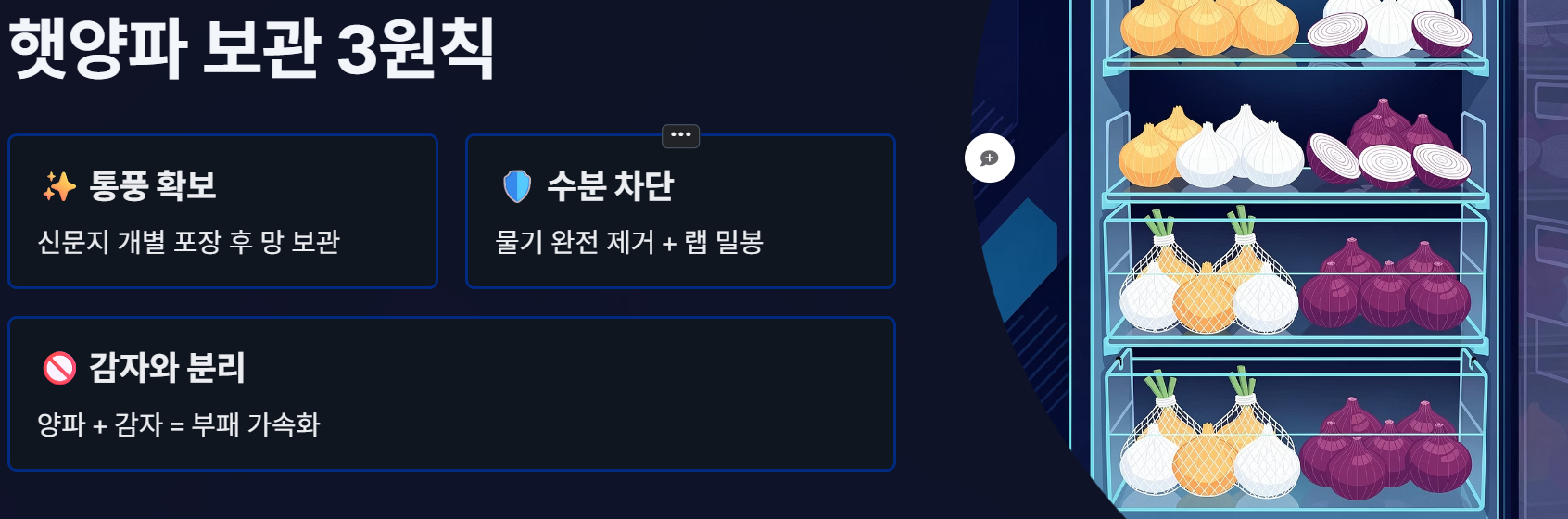 - 감자와 거리두기: 양파와 감자는 숙적입니다. 반드시 따로 보관하세요.