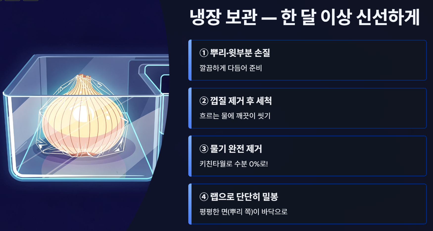 냉장 보관을 할 때는 뿌리와 윗부분을 깔끔하게 손질하는 것이 핵심입니다. 껍질을 벗긴 양파를 세척한 후에는 반드시 물기를 0%로 만들어야 해요.