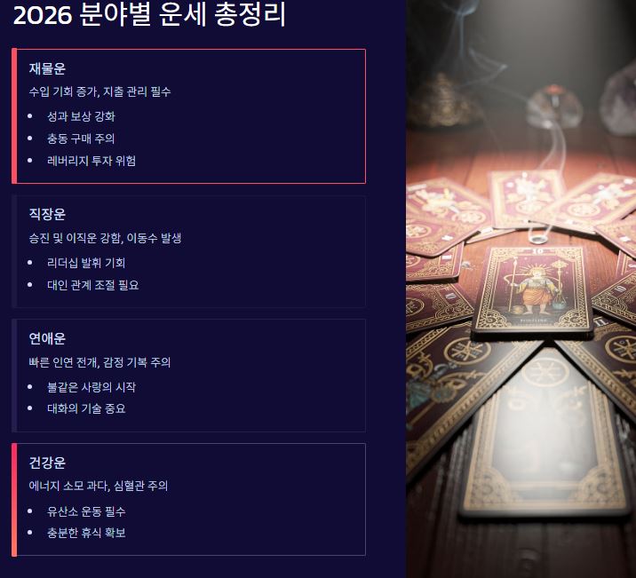 | 건강운 | 에너지 소모 과다, 심혈관 주의 | 유산소 운동, 충분한 휴식 |