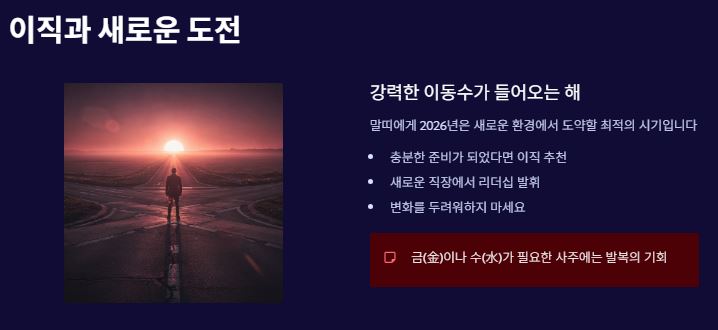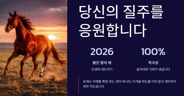2026년은 "움직이면 기회가 생기고, 가만히 있으면 도태될 수 있는 해"입니다. 적극적인 자세가 운을 부릅니다.