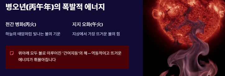 병오년을 이해하려면 먼저 '병(丙)'과 '오(午)'의 결합을 보아야 합니다. 천간의 병화(丙火)는 하늘에 떠 있는 태양을 의미하며, 지지의 오화(午火)는 지상에서 가장 뜨거운 불의 기운을 뜻합니다. 즉, 위아래가 모두 불로 이루어진 '간여지동'의 해로, 그 에너지가 가히 폭발적이라고 할 수 있습니다.