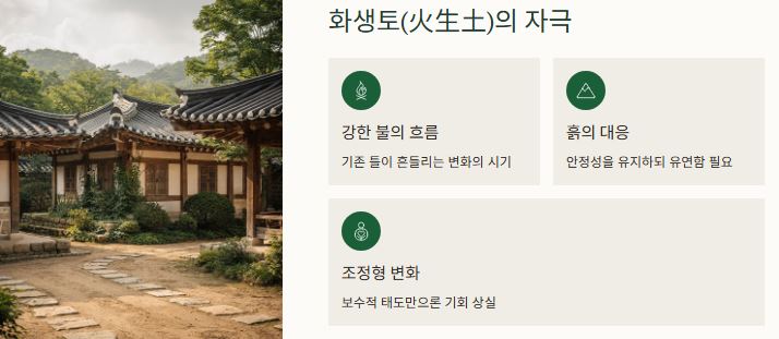 강한 불이 흙을 자극하여 기존의 안정된 틀이 흔들릴 수 있습니다. 보수적인 태도만 유지하면 기회를 놓칠 수 있으니 ‘조정형 변화’를 키워드로 삼으세요.
