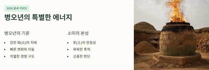 병오년은 강한 화(火)의 기운이 지배하는 해로, 변화와 이동, 그리고 경쟁이 매우 치열하고 속도감 있게 전개되는 특징이 있습니다. 반면 소띠(丑)는 토(土)의 기운을 가진 띠로 안정과 축적을 중요시하죠.