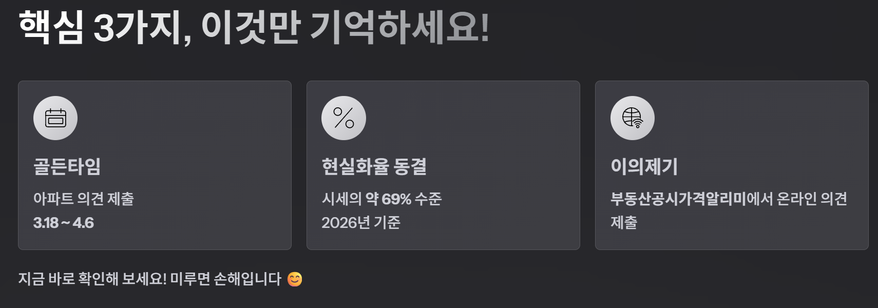 - 확인 기간: 아파트는 3월 18일부터 4월 6일까지가 의견 제출 골든타임입니다.