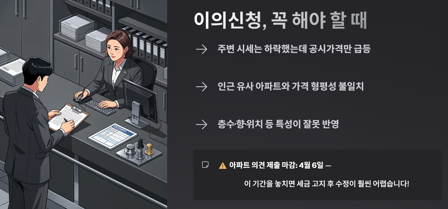 만약 주변 시세는 떨어졌는데 공시가격만 과하게 올랐다면? 4월 6일까지 반드시 의견서를 제출하셔야 합니다. 이 기간을 놓치면 나중에 세금이 나온 뒤에 고치기가 훨씬 힘들거든요.