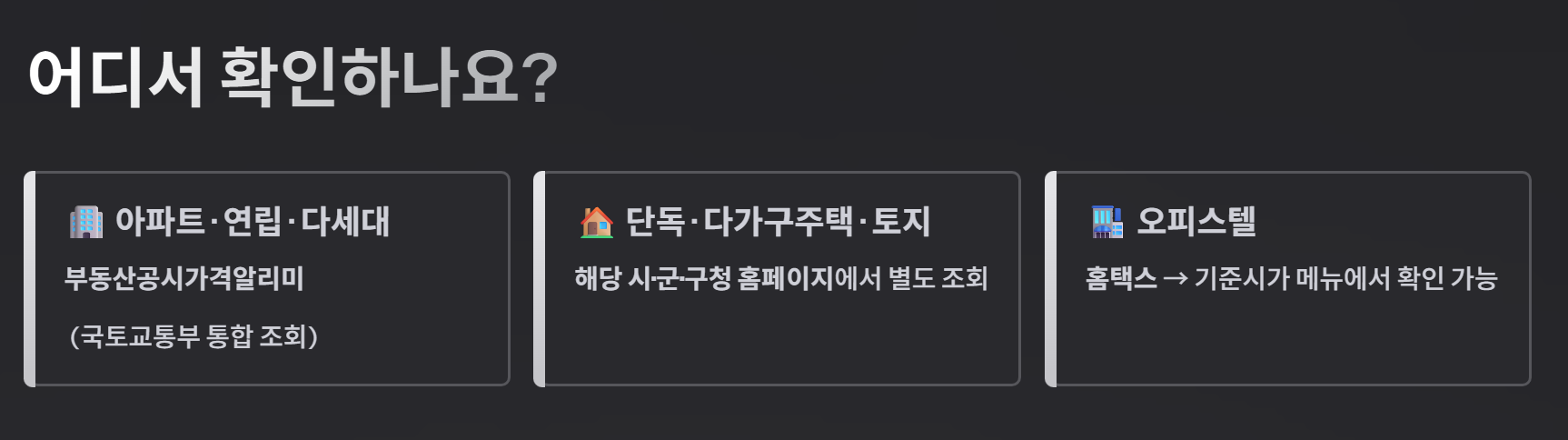 공동주택(아파트 등)은 국토교통부의 '부동산공시가격알리미' 사이트에서 통합 조회가 가능하지만, 단독주택이나 토지는 해당 시·군·구청 홈페이지를 이용해야 하는 경우가 많으니 주의하세요! (오피스텔의 경우 홈텍스의 기준시가 메뉴에서 가능합니다.)
