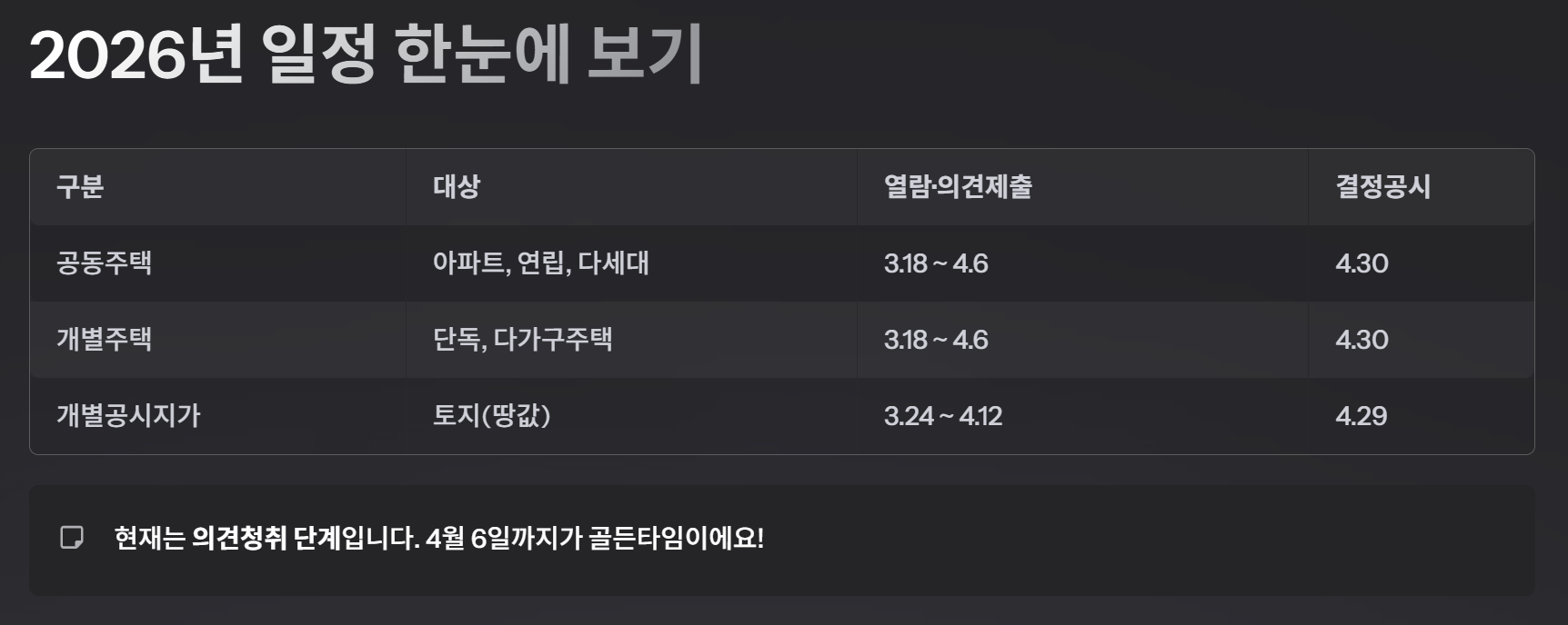 2026년 공시가격은 현재 '의견청취' 단계에 들어와 있어요. 아파트냐, 단독주택이냐, 아니면 그냥 땅이냐에 따라 확인하는 곳과 날짜가 조금씩 다르니 아래 표를 꼭 확인해 주세요!