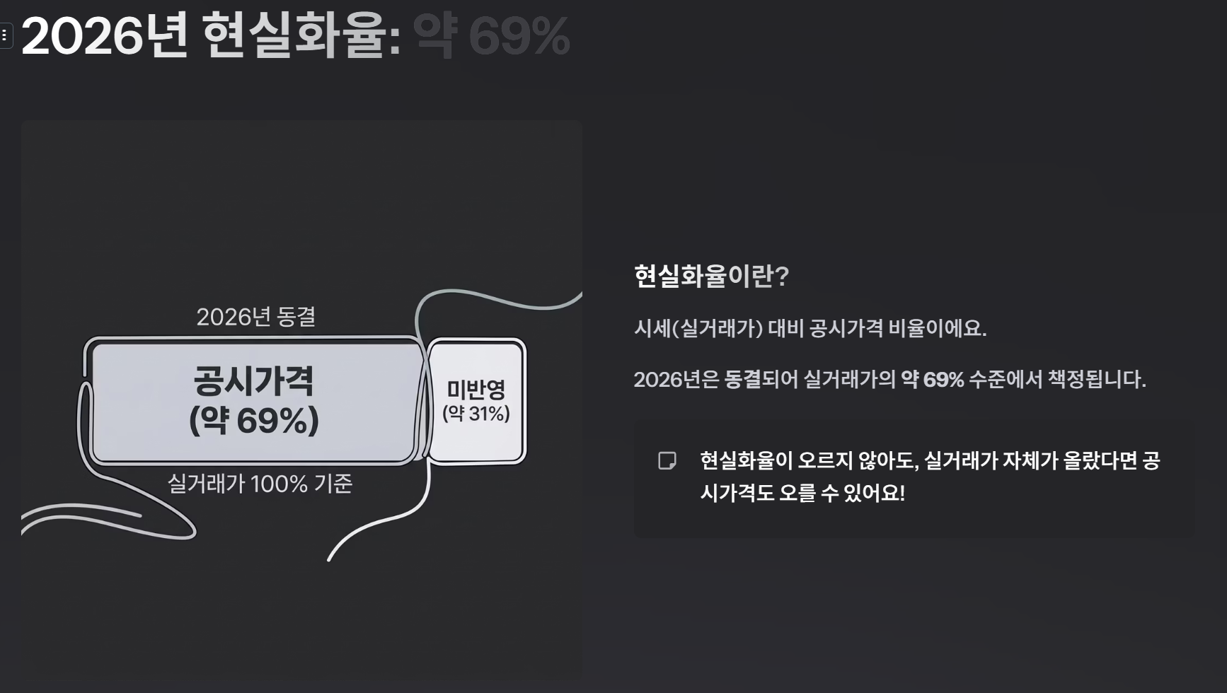- 현실화율: 2026년은 공시가격 현실화율이 동결되어 실거래가의 약 69% 수준에서 책정됩니다.
