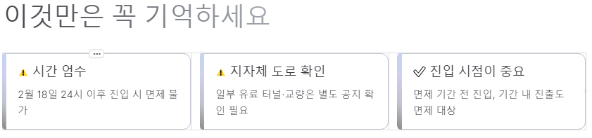 - 지자체에서 운영하는 일부 유료도로(터널, 교량 등)는 면제 여부가 다를 수 있으니 출발 전 지자체 공지를 확인하는 것이 좋습니다.