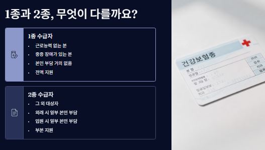 1종은 근로능력이 없거나 중증 장애가 있는 분들로 본인 부담이 거의 없으며, 2종은 그 외 대상자로 외래 및 입원 시 일부 본인 부담이 발생합니다.