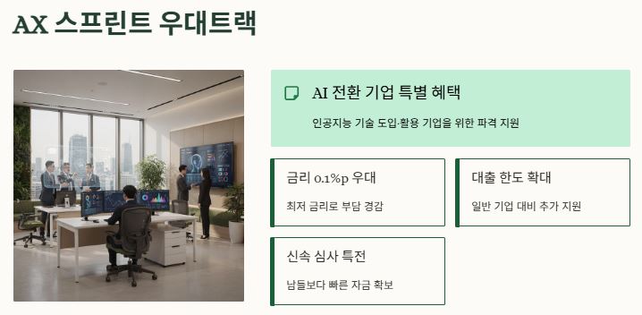 AI 기술을 도입하거나 활용하는 기업에는 금리 0.1%p 우대, 대출 한도 확대, 그리고 무엇보다 '신속 심사' 혜택이 주어집니다. 남들보다 빠르게 자금을 확보할 수 있는 절호의 기회죠!