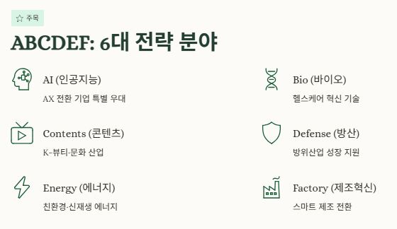 정부는 혁신 성장을 위해 6대 전략 분야(AI, 바이오, 문화콘텐츠, 방산, 에너지, 제조혁신)를 집중 지원합니다. 특히 인공지능 전환을 꿈꾸는 기업이라면 다음 혜택을 놓치지 마세요!