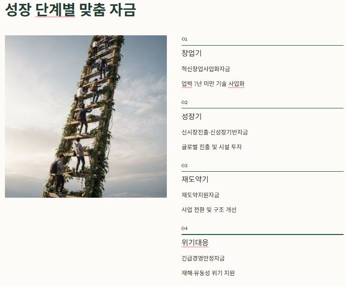 | 성장기 | 신시장진출·신성장기반자금 | 글로벌 진출 및 시설 투자 지원 |