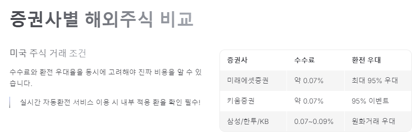 | 증권사 | 해외주식 수수료 | 환전 우대 혜택 |