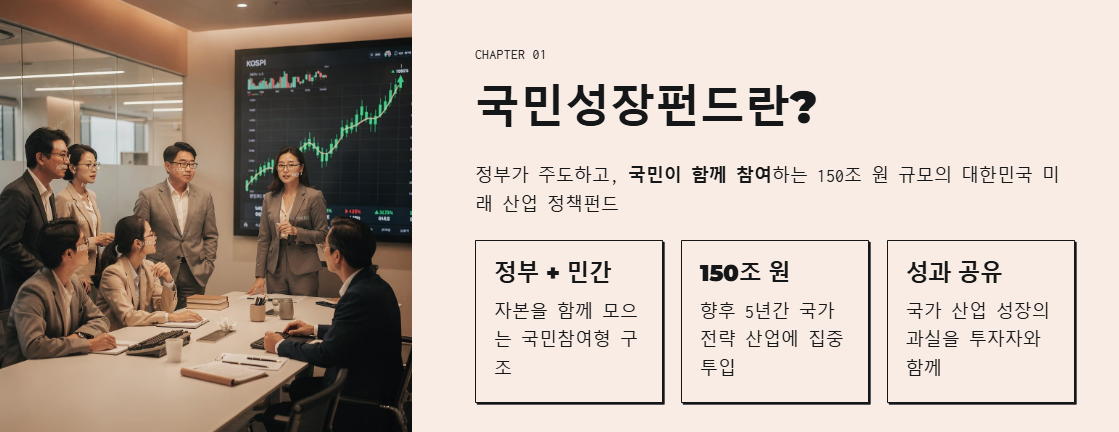 국민성장펀드는 대한민국 정부가 주도하여 AI, 반도체, 바이오 등 미래 핵심 산업의 경쟁력을 높이기 위해 조성하는 대규모 정책펀드입니다. 향후 5년간 약 150조 원 규모의 자금을 투입하여 국가 전략 산업의 기반을 닦는 것이 목표예요.
