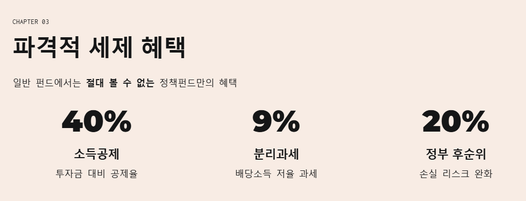 많은 분이 궁금해하시는 혜택 부분입니다. 이번 펀드는 정책적으로 추진되는 만큼 일반 펀드에서는 보기 힘든 파격적인 혜택이 담겨 있습니다.