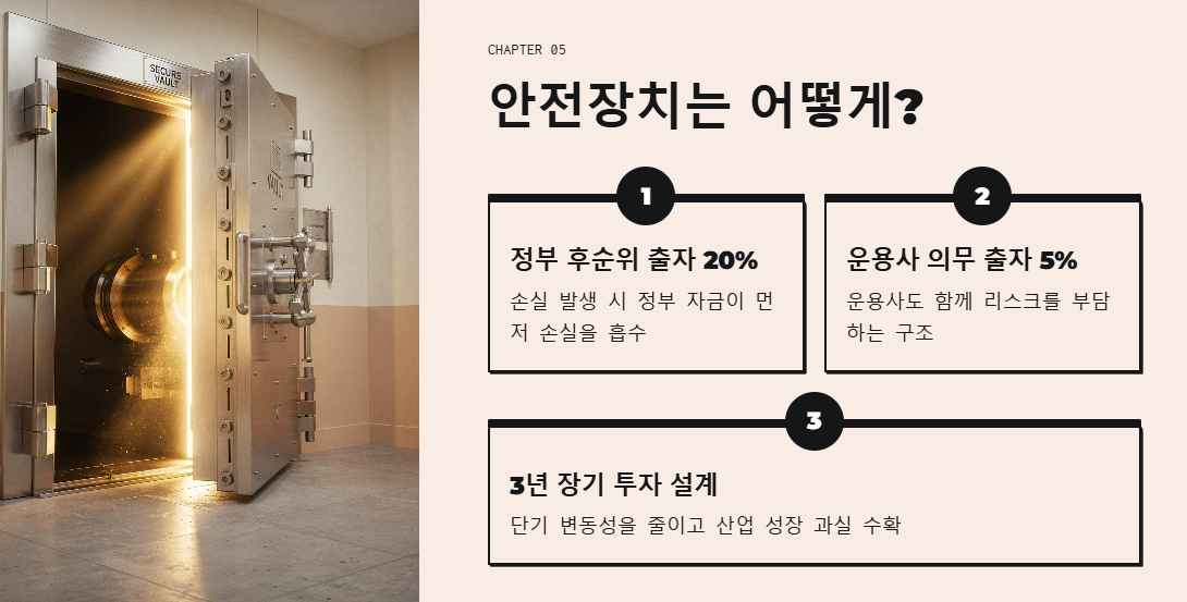 | 안정성 보강 | 정부 약 20% 후순위 출자(운용사 5% 의무 출자) | 손실 리스크 완화 |