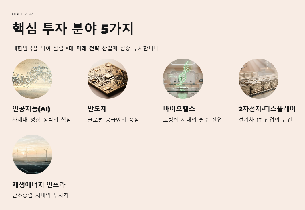 - 국가 미래 산업 투자: AI, 반도체 등 대한민국을 먹여 살릴 전략 산업에 직접 투자합니다.