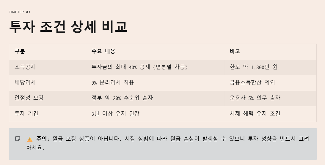 - 강력한 세제 혜택: 투자금 40% 소득공제와 9% 분리과세로 '절세 끝판왕'급 혜택을 제공합니다.