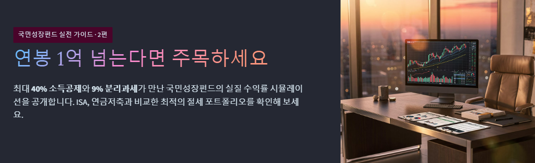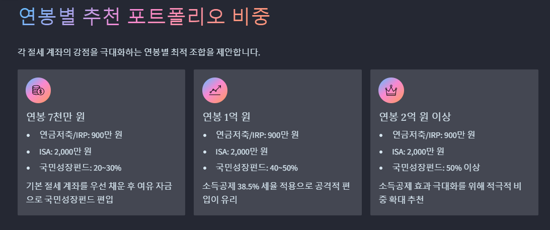 - 연봉 1억: 연금저축/IRP(900만) + ISA(2,000만) + 국민성장펀드(40~50%)