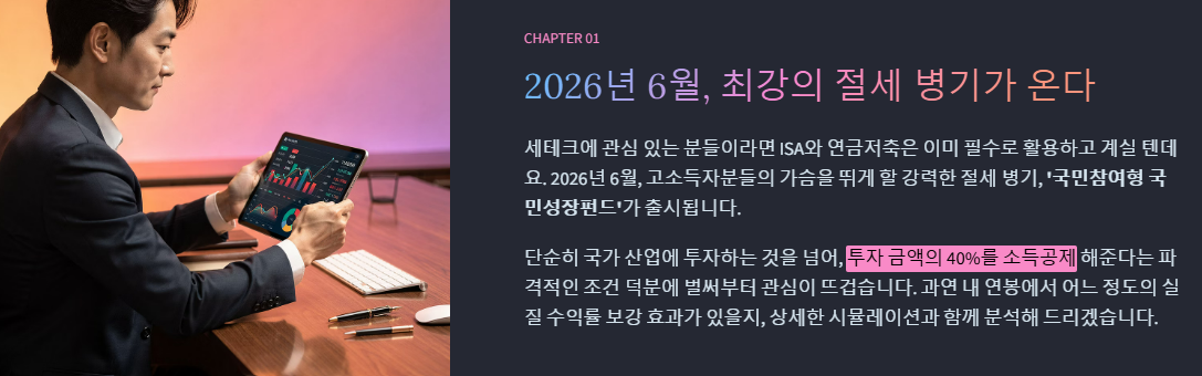 세테크에 관심 있는 분들이라면 ISA와 연금저축은 이미 필수로 활용하고 계실 텐데요. 2026년 6월, 고소득자분들의 가슴을 뛰게 할 강력한 절세 병기, '국민참여형 국민성장펀드'가 출시됩니다. 단순히 국가 산업에 투자하는 것을 넘어, 투자 금액의 40%를 소득공제 해준다는 파격적인 조건 덕분에 벌써부터 관심이 뜨겁습니다. 과연 내 연봉에서 어느 정도의 실질 수익률 보강 효과가 있을지, 상세한 시뮬레이션과 함께 분석해 드릴게요!