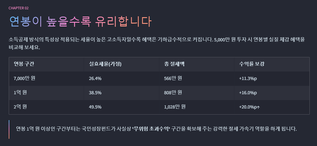 연봉 1억 원 이상인 구간부터는 국민성장펀드가 사실상 '무위험 초과수익' 구간을 확보해 주는 강력한 절세 가속기 역할을 하게 됩니다.