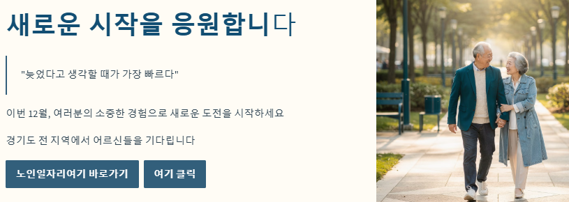 경기도는 노인 일자리 규모가 전국에서 가장 큰 만큼, 어르신들을 위한 선택의 폭도 정말 넓습니다. 수원, 성남, 양평뿐만 아니라 모든 지역에서 여러분의 소중한 경험과 지혜를 기다리고 있어요. "늦었다고 생각할 때가 가장 빠르다"는 말처럼, 이번 12월에는 꼭 도전해 보세요! 여러분의 새로운 시작을 제가 온 마음 다해 응원합니다.